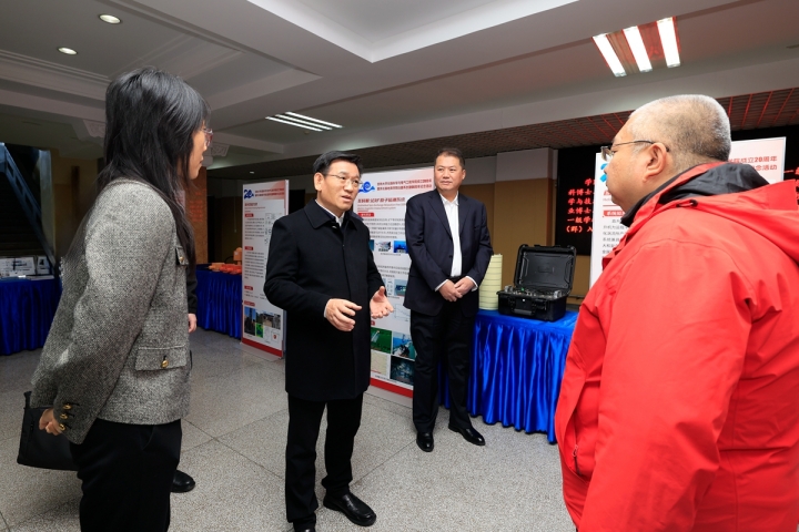 在地质宫一楼大厅,田辉参观了学院成立20周年科技成果展,考察了量子重磁传感器工艺与测试平台、地震勘探传感器研究及测试室等,听取了关于人才引进、平台建设、科研攻关和成果转化等情况的介绍。田辉鼓励学院教师聚焦星、空、地、海、井,全面服务国家战略,面向未来社会信息化、智能化需求,依托学校相关学科群优质资源及地学仪器领域优势特色,发挥深部探测与成像全国重点实验室重要策源地作用,探索高质量人才培养体系,推进高水平科学研究与成果转化,加强高层次人才队伍建设,向着深地、深海、深空等国家战略方向进军。