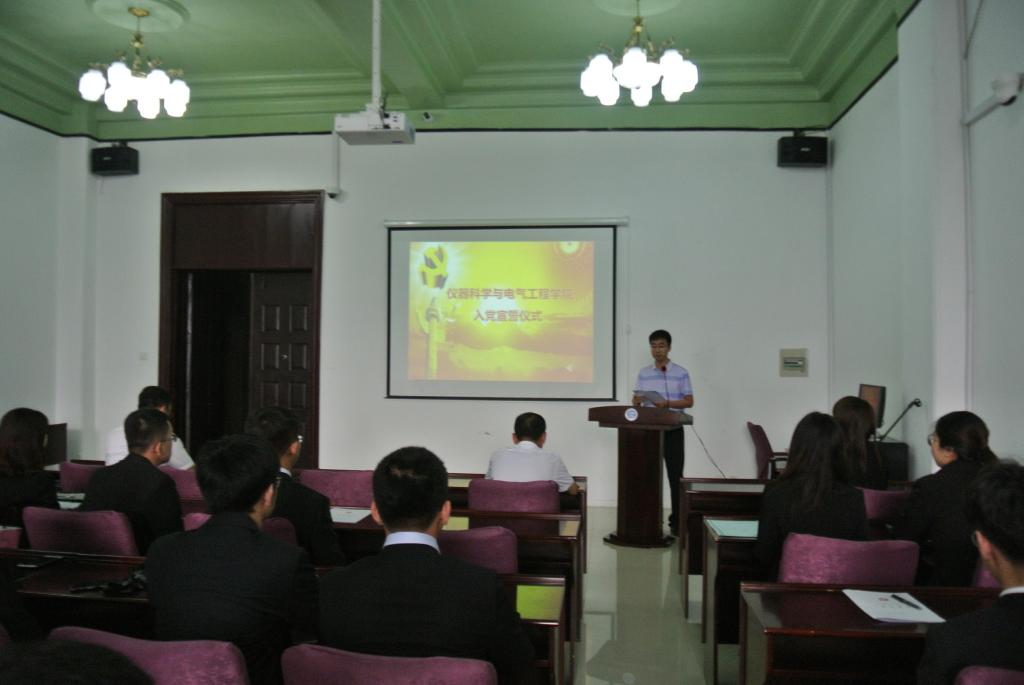 党委办公室主任刁庶带领全体党员面向党旗庄严宣誓。之后,研究生党支部新党员代表梁冰琪同学、入党积极分子代表周路佳同学分别做了发言。最后,院党委书记王爱民同志代表院党委做了深刻、精彩的讲话。王书记向全体学生党员提出了明确的要求,一是加强学习,不断提高理论水平和认知能力;二是积极工作,争取早日成为一名合格正式党员;三是知行统一、脚踏实地的做人做事。他希望同学们时刻严格要求自己,爱岗敬业,奉献进取,做一名组织放心、群众信赖的合格共产党员,以良好的精神状态,饱满的政治热情,以开拓进取、踏实敬业的工作作风,为实现中华民族获得伟大复兴中国梦贡献自己的一份力量,成为名副其实的共产党员。