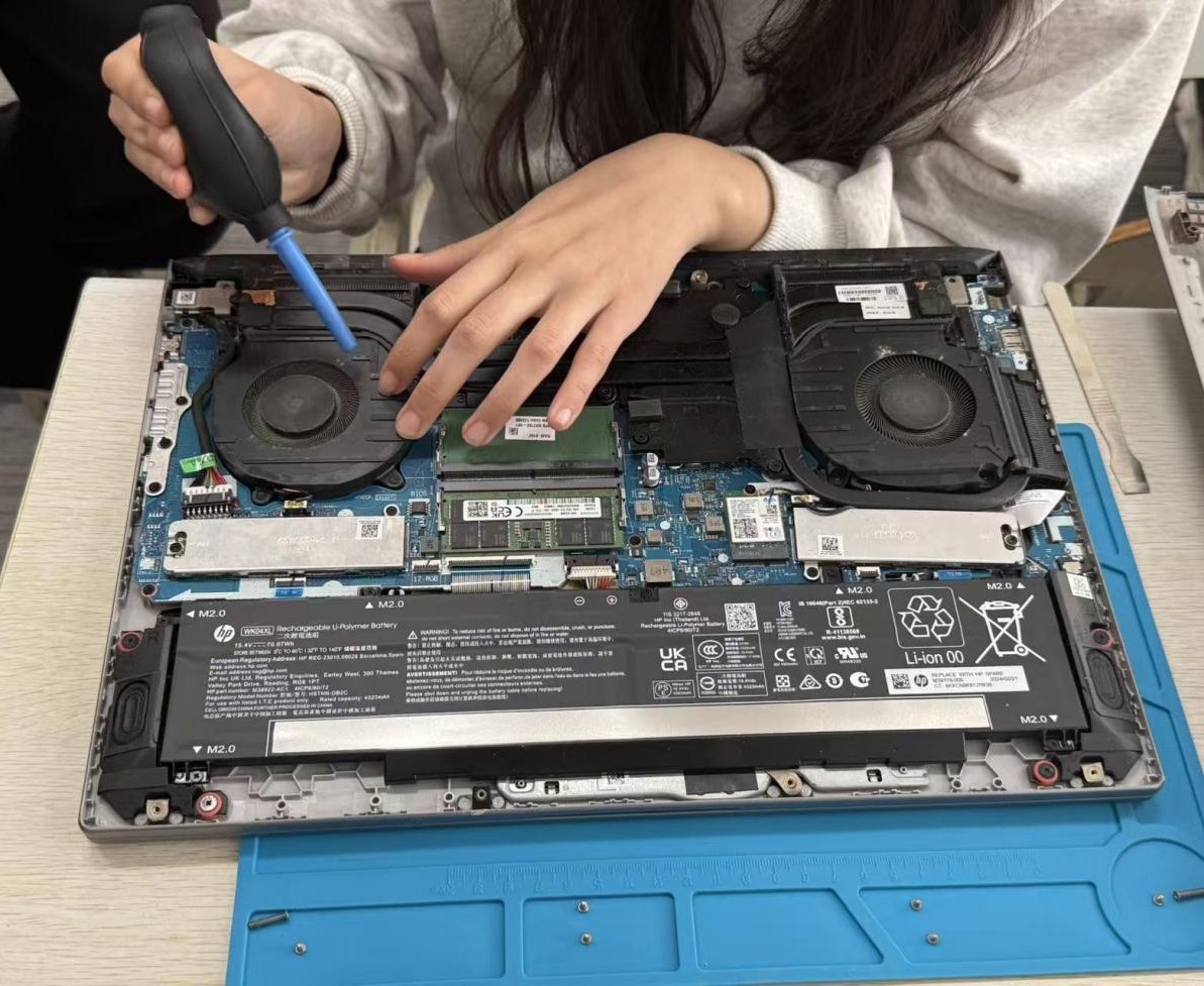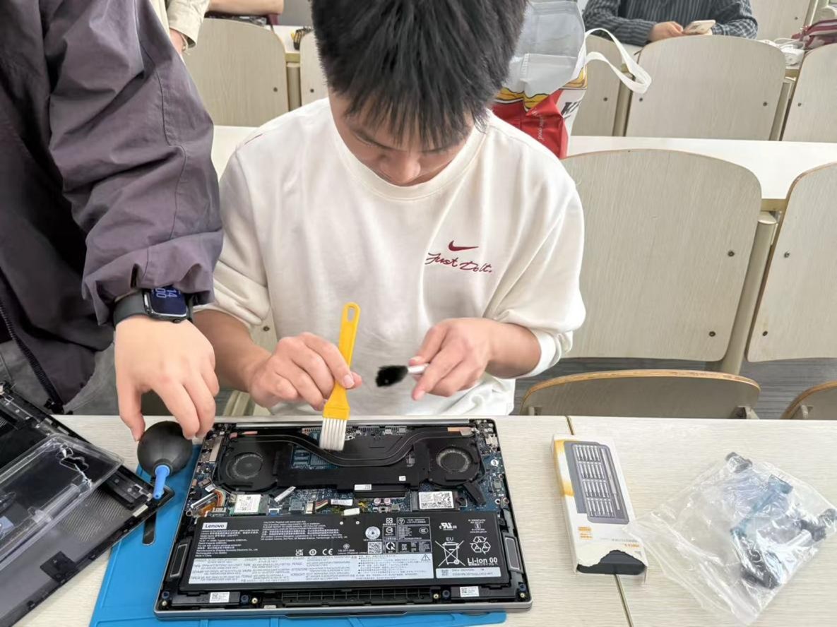 活动现场,志愿者们分工明确、操作规范,使用专业工具为同学们的笔记本电脑提供深度清灰、更换硅脂、维护散热系统筹服务,同时耐心解答同学们关于电脑日常保养、使用维护的相关问题,全程细致严谨、热心专业,确保每一台设备都得到高效、安全的维护。